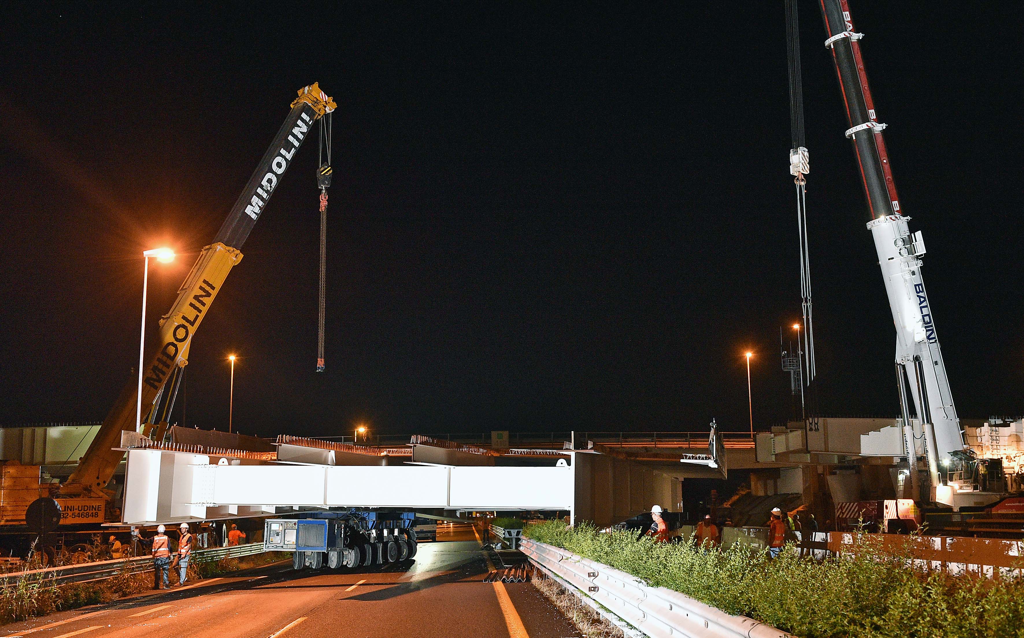 L'ultimo sovrappasso del terzo lotto (Alvisopoli - Gonars) lungo l'autostrada A4 Trieste - Venezia è stato varato. Si è trattato di un intervento complesso che ha visto impegnate circa 50 persone, tra tecnici, saldatori e operai delle ditte appaltatrici.
